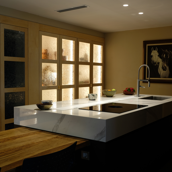 Glass for kitchen furniture, textured and treated with mica powder.