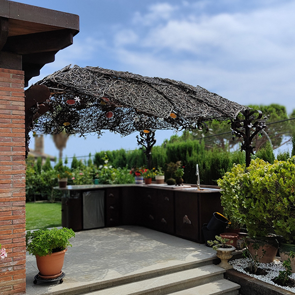 Porche artesanal diseñado y hecho a tres bandas, con estructuras de hierro y mimbre y aplicaciones de vidrio.