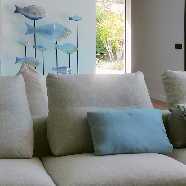 Escultura de peces de diferentes medidas creada especialmente para el espacio bajo escalera de la vivienda.