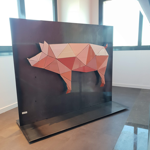 Escultura de ferro i vidre creada a partir de la figura d’origami del logotip de l’empresa.